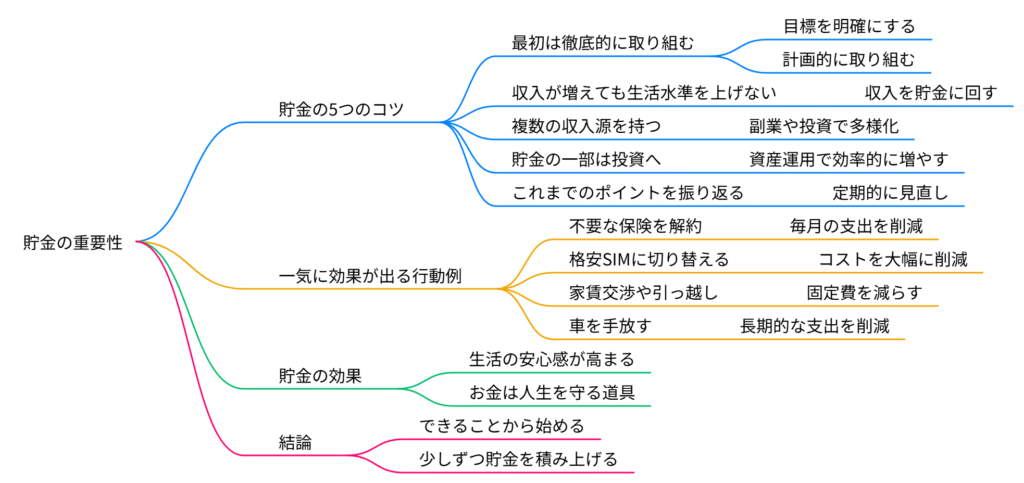 貯金を増やすためのコツは五つあり、①最初は徹底的に取り組むこと、②収入が増えても生活水準を上げないこと、③複数の収入源を持つこと、④貯金の一部を投資に回すこと、⑤定期的に学び直すことです。